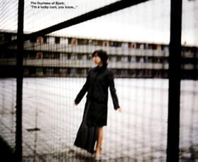 when I was a teenager.» This was before you came here? «This was before I came here. I was beig too lazy, so I went on a mission. I knew I had to put myself in an emergency situation, like Bruce Willis in Die Hard or something to get all these things out of me. So when I came here, I thought, 'OK, let's go for a hardcore mission. Wooarrgh!' I knew it would take two albums. And that's why I called them "Debut" and "Post" - before and after. And now it's like a new crossroads for me. In a way, "Debut" and "Post" were a collection of duets. A lot of people wrote the beats with me. I started this one intending that "Homogenic" would just have one flavour, but then the thing with Mark Bell just happened... The reason I'm talking so un-organisedly is because what I set out to do has become something else...» What to you mean? I'll tell you how I felt before. I thought, 'It's really easy to hold the person's attention for 35 minutes if you've got 900 toys.' Doing "Debut" was like, Wooooah! Like a kid in a toystore. It's like, 'I can have anything? Cool!' But I thought the true challenge was to have almost no toys, down to one stick, without a second of boredom. My idea was to have just strings and beats and a voice, the strings on the left and the beats on the right and the voice in the middle. With the balance button on the stereo, people could pick the ambient version or club one, or both. That's a great theory, but in practice, when the songs started growing, it changed.» Why did you decide to work with the RZA from the Wu-Tang Clan? «When I started this album, in a strange kind of way I was trying to go back to what I'm about, you know? How can I put this? It's so hard, such a big question. .. I'll try to be short and quick. But, I went away from Iceland four years ago and started this completely frantic, very exciting lifestyle. I went around the world and visited all these places, lots of clubs, lots of exciting people... So when I did this album I was like, 'What am I made of?' And I'm from Iceland, I'm born '65. Iceland is full of fucking ruptures, very raw lava. I'd wake up in the morning and have a walk by the ocean and scream and sing. There's snow blizzards and people might die because the weather's terrible - all these kind of things. I wanted to get closer to what that is, because Icelandic music doesn't really exist... I'll try to go back to the RZA thing.» Thanks... «I thought, 'OK, Icelandic music would be very phat techno beats that are unfinished and distorted, like eruptions.' I listen to a lot of Icelandic string music, so i wanted that. I thought, 'Who can I work with...?' I started off with an engineer and we did a lot of beats that were just, Pchh-pkk-up-chhhu! And then I thought that RZA's beats were just gorgeous because they're really simple and really raw. I can't remember if RZA contacted me first, but it seemed to be a very mutual sort of thing. He said he wanted to come to Spain, but the Wu-Tang album took longer than they thought. Then I met them in New York.» What were they like? «Oh, they're gorgeous, like big teddy bears. They fall asleep in piles, do you know that? They're just like [snores]. Derek fell asleep on the studio floor at six un the morning and before he knew it there were five Wu-Tang members on top of him [lies across my lap and pretends to snore]. They're just gorgeous people. And so we started off doing one track. It's just doing my head in. I still think we can do better beats on that one. What he did was brilliant, but it was just not the right timing. I was out or something, and when I got back, he'd got all the strings people in and recorded them.» Will that track be on your album? «I haven't decided. He asked me to write melodies on his album and make it my album but... that's just not right. Maybe I shouldn't even be talking about this, but I think, this album, it's just him.» You've called last Summer's events «my crash». «At the beginning of September, when the bomb was sent to my house... OK, that was terrible, the guy died, terrible. But that was just the tip of the iceberg. My whole life exploded in one way or another in one week. Where do you live Bjork? You've been in a suitcase for four years! When I say this, I'm not doing the Kurt Cobain, or anything. I'm not saying, 'Oh, poor old me.' No fucking way. Look at me, I'm a lucky cunt, you know? I've had a really top time, working with the most exciting, creative people. The most ridiculous, gorgeous situations I've been in. I've still got my mates, still got Iceland, still got my kid. So I'm not moaning, I'm not moaning. But what I'm saying is, you go away from Iceland, and, Arrggh!, jump out of an airplane with no parachute and you're going 9,000 miles per hour for four years. It's not a situation where you're gonna fade out. You're gonna go, Pshewtt!, and you start a new period in your life.» How did going through that affect the music on the new album? «Well my