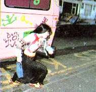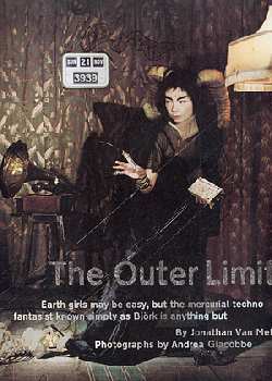 Björk and her boyfriends have been the subject of much scuttlebutt; she counts among her exes fashion photographer/video director Stephane Sednaoui and dance-floor machers Tricky and Goldie. One gossip column item had the two fighting over her in a New York City nightclub. When it is suggested that the pattern to her choice in men might be labeled "insufferable geniuses," she doesn't flinch. "They're very obviously geniuses," she says, "straight in your face. But for me, the guys I had the most fantasies about as a child were David Attenborough and Carl Sagan. Really. In school, I would fall for the guy in the back of the class with really thick glasses and the insect collection who told you about the solar system. It's these people who show you these secrets. They pull out this "rock" - she gets out of her chair and lifts up the cushion she's sitting on as if it were the rock, and then leans in, staring at me, widening her eyes in mock wonder - "and they go, "Do you want me to show you a lot of really strange things that nobody's ever seen?"" She looks back under the "rock" and then back to me. "It just drives me nuts. It gives me 53 hard-ons. That's what turns me on." "I dare you to take me on," Björk wails from the tiny stage of the Sugar Shack in Munich as she sings "5 Years" to a firetrap-capacity crowd of sweaty, happy, twenty-something Germans. Fifteen minutes later, Björk bounces offstage and into the dressing room, all soaking wet hair and crazy eyes. The brief set - six songs from Homogenic - went better than anyone expected, and she is clearly relieved and thrilled. As she drums madly on a table with her hands, Mark Bell and the rest of her crew pile into the dressing room. "That was our most crowded rehearsal ever!" she says to the group, and they all laugh uproariously at what is obviously a joke at her own expense. Björk, it turns out, does not like to rehearse. She prefers, she says, "jumping off a cliff." As everyone pairs off and recaps, Björk says to the engineer, "The best thing about the show was what you and Mark were doing. So tight. Every sound was perfect." Her sweaty hair is now clumped into little daggers all around her face. "I'm just glad I got my 'Aaaaah!' right. One-two-three, 'Aaaaah!'" Suddenly, the PA guy, who couldn't see the stage from the back of the room because the crowd stood on the furniture, shouts, "It was like setting off fireworks in the fog: "Oh, that must have been a pretty one! Oh, that must have been a loud one!" Everyone falls out laughing, Björk loudest and longest. The day after the Munich show, I am waiting in the airport for my flight