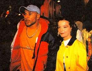 Watching and listening to Björk talk - and eat - is an event unto itself. She rolls her R"s in about 19 different ways, perhaps because she learned English in several accents, including Mancunian, Scottish, southern Cockney, and French, as well as. she says, from "quite camp drag queens in America." She also makes the most amazing faces - baring her teeth, wrinkling her nose, widening her eyes - and pulls on her face and hair constantly. A few journalists have noted that Björk often, and without embarrassment, picks her nose, and sure enough, in the middle of one riff or another, one of her little fingers found its way up to one of her cute little nostrils and wiggled itself around, before being called away to perform another spazzy, adorable gesture. One Friday night, Björk arrives at Bar Rumba, a small, newish club near Picadilly Circus where her current boyfriend, U2 techno swami Howie B, is on the DJ lineup, along with Ben Watt from Everything but the Girl. According to Björk, she doesn't go clubbing like she used to, so tonight is all about running into old friends, a situation that makes her "hyper." She spends most of the evening clutching a cocktail, surrounded by people who know her, pretend to know her, or want to know her; every time the crowd gets too thick, she escapes to another room, onto the dance floor, or up into the DJ booth, where she lovingly watches Howie B work his magic. The two first met when Björk moved to London in '91, and they became best friends. Suddenly, she goes all girlish and demure. "Last February we started going out together." She bats her eyelashes, and puts her hands over her mouth.