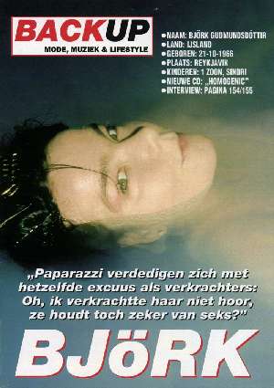 Pers en paparazzi "Mensen beseffen soms niet hoe vervelend het kan zijn", spreekt de frele zangeres. "velen begrepen niet waarom Diana altijd klaagde over de paparazzi. Ze had toch zeker alles wat haar hartje begeerde? Maar inmiddels hebben ze haar wel vermoord! Uiteraard kreeg zij vijfduizend keer meer aandacht dan ik, maar ik kan wel een beetje uitleggen hoe het voelt. roem brengt meer druk mee dan alleen leuke dingen. Voor mij is de grootste luxe niet kaviaar, feesten of een diamanten horloge. De grootste luxe is dat ik 's ochtends wakker word, een song heb gedroomd en zomaar naar een studio van mijn keuze kan vliegen om het dezelfde dag nog op te nemen. Waar ook ter wereld, en met mijn favotiete muzikanten. Dat is letterlijk een droom die werkelijkheid wordt. De rest is bagage waar ik niet om gevraagd heb. Ik doe mee aan foto's, intervieuws, tournees; alles om die liedjes kunnen blijven opnemen." Voor bjork is er een duidelijk verschil tussen pers en paparazzi. "doe ik een interview of fotosessie, dan stel ik me kwetsbaar op en laat een stukje van mezelf zien. Dan ben ik naakt. Maar dat is oke, want we hebben het tenslotte afgesproken. Als ik echter door mijn raam in m'n pyjama word gefotografeerd, terwijl ik met m'n kund sta te praten, dan is dat verkrachting! Paparazzi verdedigen zich met hetzelfde excuus als verkrachters: 'Oh, ik verkrachtte haar niet hoor, ze houdt toch zeker van seks?' En dat valt zeker in mijn geval nog mee, maar Lady Di werd 17 jaar lang 24 uur per dag gevolgd; een recept voor krankzinnigheid." Turbulent jaar Bjork's fraaie derde solo-album "homogenic", is een stuk donderder en meer ingetogen dan voorgangers "debut" en "post". De elf stemmige liedjes verschijnen na een turbulent jaar waarin het incident in Bangkok niet eens het dieptepunt was. De zangeres komt echter met de verrassende uitleg dat ze zelf op zoek was naar alle ellende: "ik had een heerlijk leventje in IJsland. Ik had een grote familie en leefde in een van de veiligste landen ter wereld. Ik tourde over de hele wereld met mijn band the Sugarcubes, maar ik kon altijd terug naar dat veilige nest. Ik dacht dat ik IJsland nooit zou verlaten. Maar op mijn 27e zocht ik opeens een uitdaging, wilde ik de duistere kant van mezelf ontdekken. Ik wilde niet langer een makkelijk leventje leiden en ik kreeg het ook niet. Ik zocht gevaar en ik vond het." ![]()
