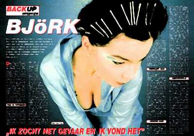 Donkere kant Bjork verhuisde naar Londen om zich vol overgave in het flitsnede danswereldje te storten. Met behulp van mensen als Nellees Hooper, Tricky en Goldie lanceerde zij haar succesvolle solo-carriere maar kwam tegelijkertijd volop in de schijnwerpers te staan En dat brengt altijd de aandacht van een enkele idioot met zich mee, zo ontdekten eerder al John Lennon en Monica Seles. Bjork (met een spannend lachje): "ik voelde me aangetrokken, zelfs geobsedeerd door mensen die in contact staan met hun dondere kant. Dat is heel belangrijk, je kunt per slot van rekening niet je leven lang een soort Julie Andrews blijven. Ik denkt dat ik in die tijd bewust een bepaalde boodschap uitstraalde. een boodschap die uiteindelijk terechtkwam bij een totale onbekende die besloot niet meer te willen leven en mij met hem mee te nemen. Daarom stuurde hij mijn een bom". Het verhaal is bekend: de Britse PTT onderschepte het levensgevaarlijke pakketje en de afzender een gestoorde Amerikaanse fan, pleegde zelfmoord vordat de politie hem kon arresteren. Een hevig geschokte Bjork had plotseling genoeg van haar donkere kant en trok naar Spanje voor de opnamen van "homogenic". Bjork: "het was tijd om dingen te overdenken. Ik besloot dat ik genoeg van de duisternis had geleerd, dat het een kwestie is van leven en dood kan zijn. Morgen is het messchien jouw beurt." Kindvrouwtje Op "homogenic" doet Bjork zoals gewoonlijk, weer alles zelf.