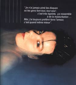 ![]() ![]() "Je n'ai jamais aime les disques ou les gens font tout, tout seul: c'est tres egoiste, ca ressemble a de la masturbation... Moi, j'ai toujours prefere faire l'amour, c'est quand meme mieux". ![]() |