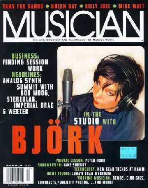 "In Some of the songs I followed her secondary vocal lines; there was very little harmony and very few chords. I was doing that on 'Isobel' too, where I wrote a natural C in a line that was in B minor. Much later on I learned that Björk is the type of singer who will sing the A sharp in A minor, but I wasn't yet aware that she did that when I did that first song. It's just something I felt about her." Deodato's old-fashioned pencil-on-paper approach blends nicely with the sample-churning techniques his younger colleagues embrace. Rather than diminish his contribution, both he and Björk feel that his traditional skills make him all the more valuable - and exotic - a commodity. "That's where I shine, because all most people can do these days is program their drum machines and sequencers," he smiles. "They will take samples from television, which they have already heard from other movies; that's just rewriting, not writing. Sure I can sample but nothing ever beats the real thing." He looks up to the cloudless sky, stretching his arms wide. "I'm here, Sitting in the sun, with beautiful mountains and this incredible view, in the company of Björk and all these musicians. I can't sample that." Then he looks our way and winks. "But I can compose it." It's after midnight, once again. Musicians, production staff, and hangers-on have wandered off to their rooms, out to the pool table, or into the night Björk sits on her canopied bed, thinking back to another part of her musical roots. You studied classical music from ages five to fifteen. What was the most important lesson you learned in music school? The best thing was that it introduced me to all music. ... Well, that's not true. That was another thing I learned. "Classical music is really music from Germany over a period of two to three hundred years. You go to the classical Section at Tower Records, and it's German music. That says a lot about the history of humans for two thousand years, because we've been making music all this time. My obsession was always to work with people to create something that had never been created before. That became very obvious in my school. I had a lot of meetings with the headmaster. He would sit there and say, "What are you doing with yourself? You've got this talent, and you're just wasting it! You've got no concentration!" It was like a love/hate relationship between us. I used to go to his classes, and he'd try to make me work. But I'd just sit there and cry my eyes out. I couldn't fit in the mold. He was Jewish; he escaped from Germany to Iceland just before the war. But I'm Icelandic; I've got a voice, and it doesn't have to be so complicated. It's just about me and you communicating. That's my biggest turn-on, to meet someone who comes from a completely different place than I do. I'll show them everything; I'll give them everything I've got. For me, that's creating: One plus one is three. As you grew up, you weren't exposed to much electronic media, radio or television. Did this present any problems in learning to create in the language of pop culture? For anyone to communicate, you have to make an effort. Whether you're born in Idaho with American TV or in Guatemala, you'll always have to fight certain barriers to communicate. For the first few years I sang, I used no words. Then very Slowly I started throwing one or two Icelandic words in there. When I was eighteen I did my first tour abroad, and I would translate one or two words into English, sing the rest in Icelandic, and do noises as well. Communication is about energy. That's how we are, and the language Sometimes doesn't matter all that much. Are your English lyrics literal translations of original words in Icelandic? They're as literal as they can get. Icelandic is quite personal to me. I've tried to do interviews like this in Icelandic, but I can't. I just feel like I'm lying, because English is in the head, being clever, analyzing myself, seeing myself from the outside. Icelandic is personal and private. I still can't translate certain lyrics, because they're just too intimate. Do you dream in Icelandic? It