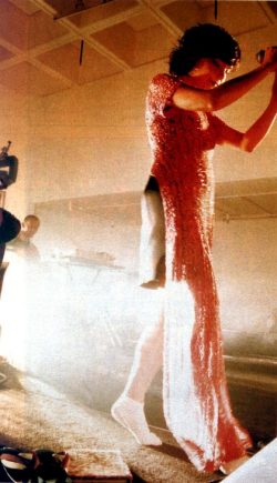 ![]() Ohne Schuhe und mit Trippelschritten tänzelte Björk über die Bühne, während Marc Bells Klanggewitter sich krachend entluden |
